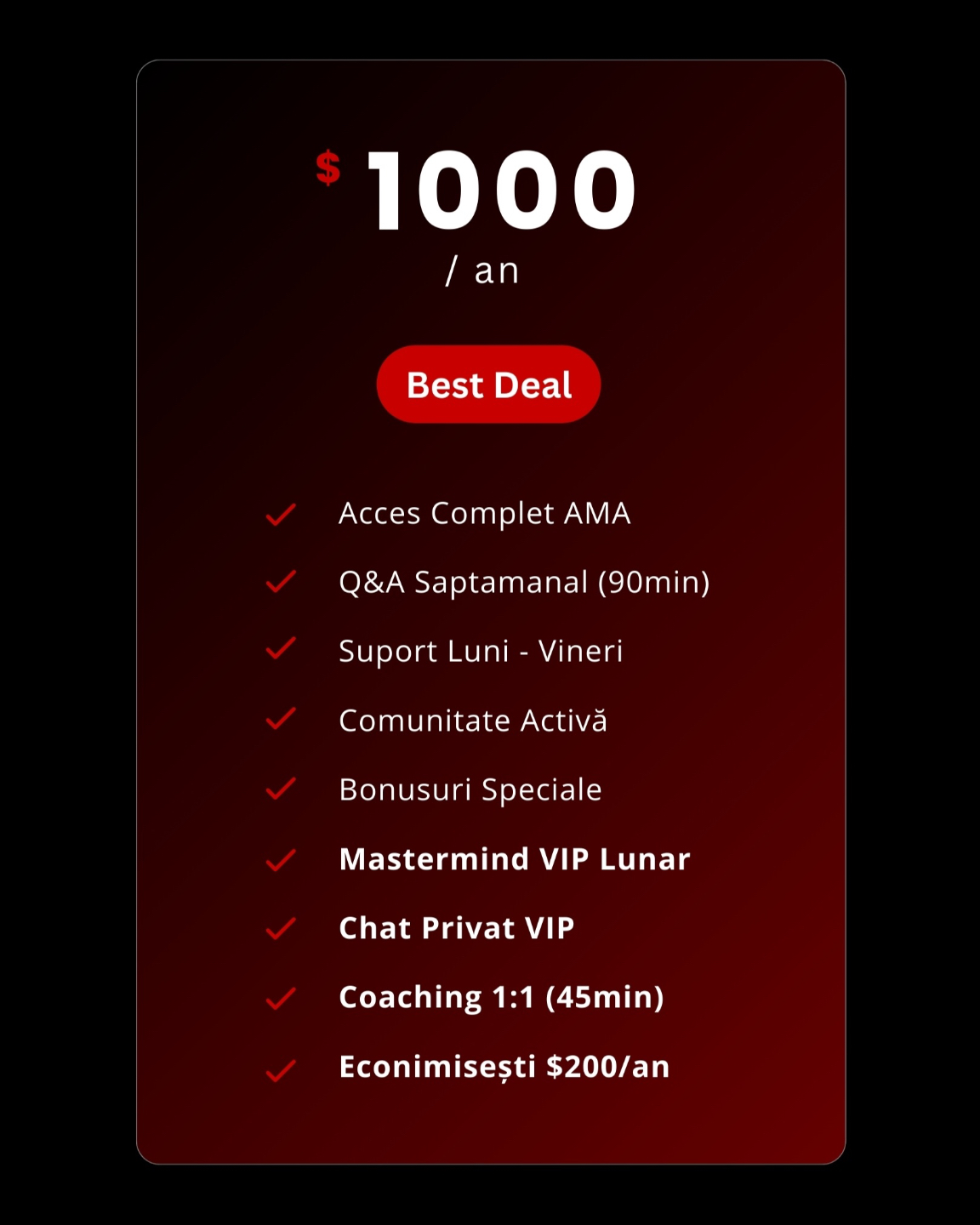 💡 1x sesiune live Q&A săptămânală (90 min) – strategie, claritate și răspunsuri directe la provocările tale.