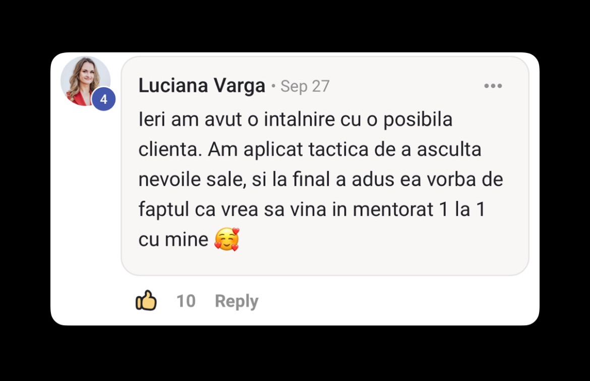 ✓ Rezultatul: Nu mai bâjbâi. Știi exact cui te adresezi, cum să comunici și ce vinzi.