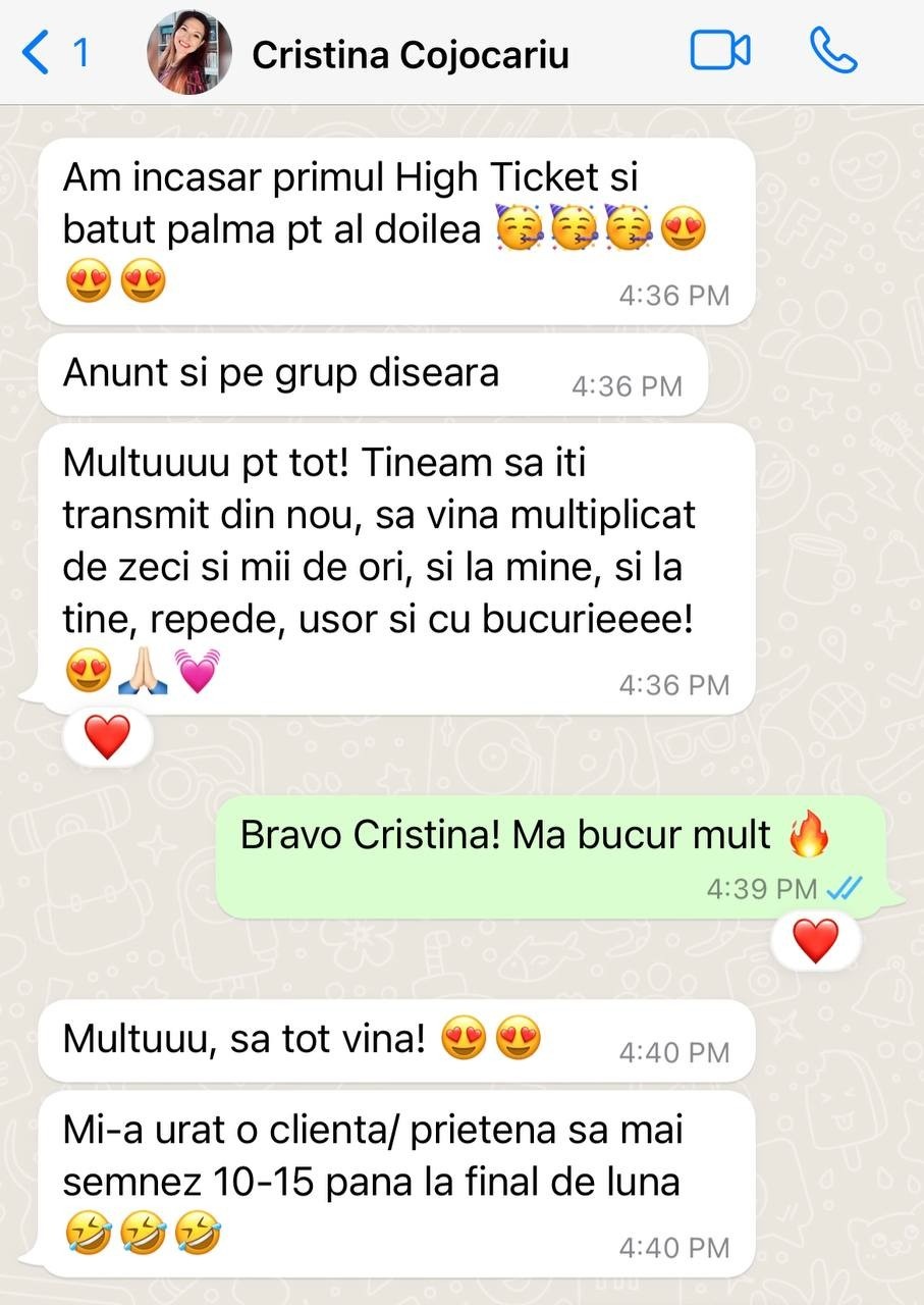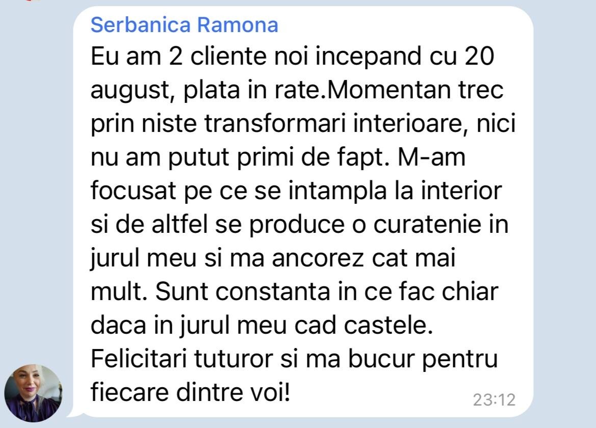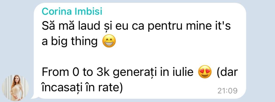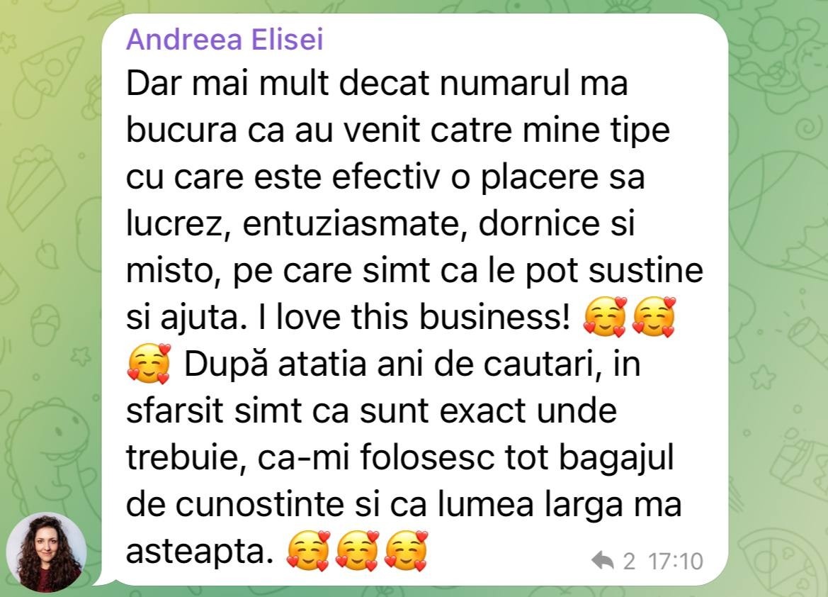- Acces la grupul privat de Telegram* - cand te-ai inscris, vei avea acces la un grup privat unde vei intalni alti oameni ca tine care promoveaza online si pot sa-ti ofere inspiratie si sustinere.